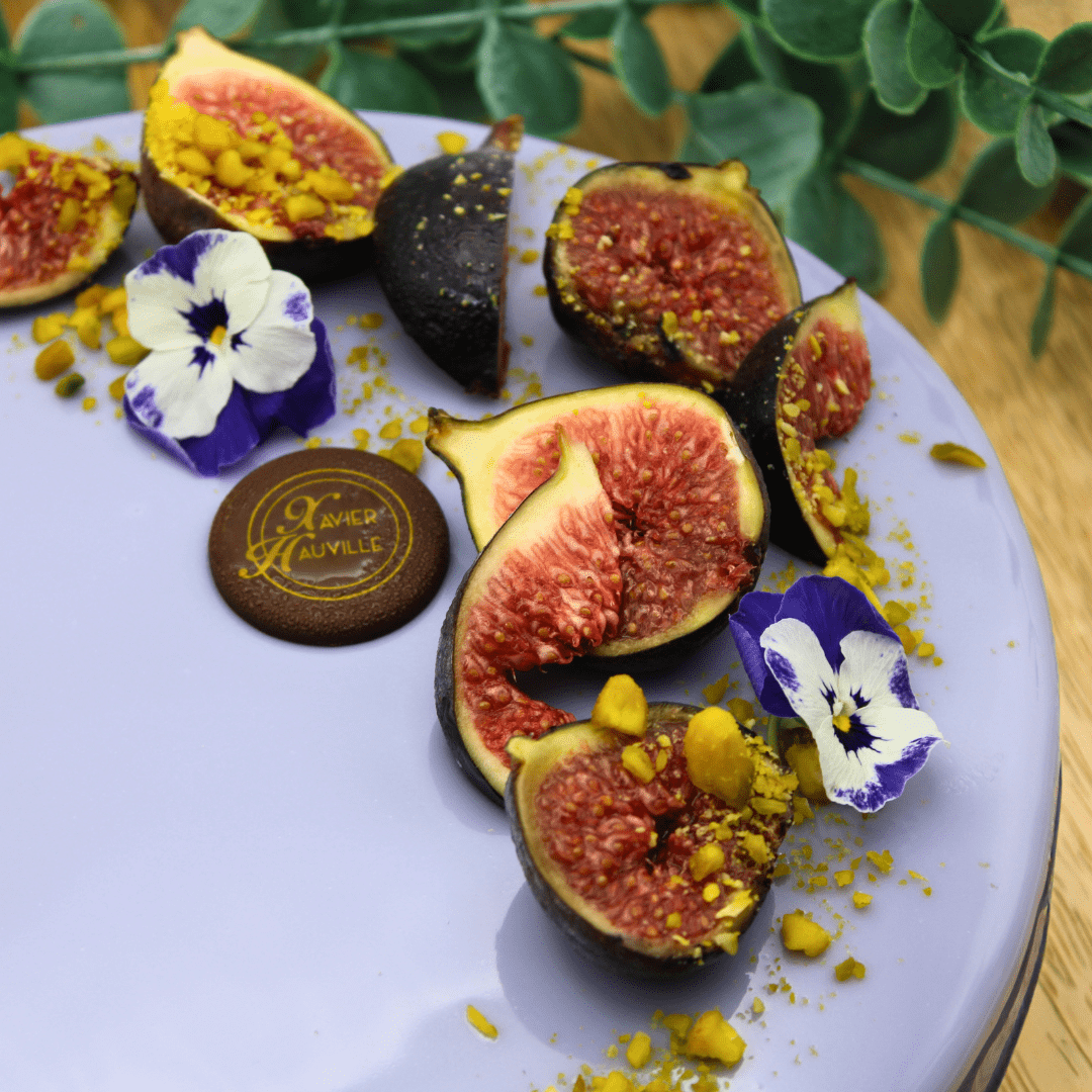 Bavarois verveine, pain de gênes pistache, croustillant pistache et compotée de figues