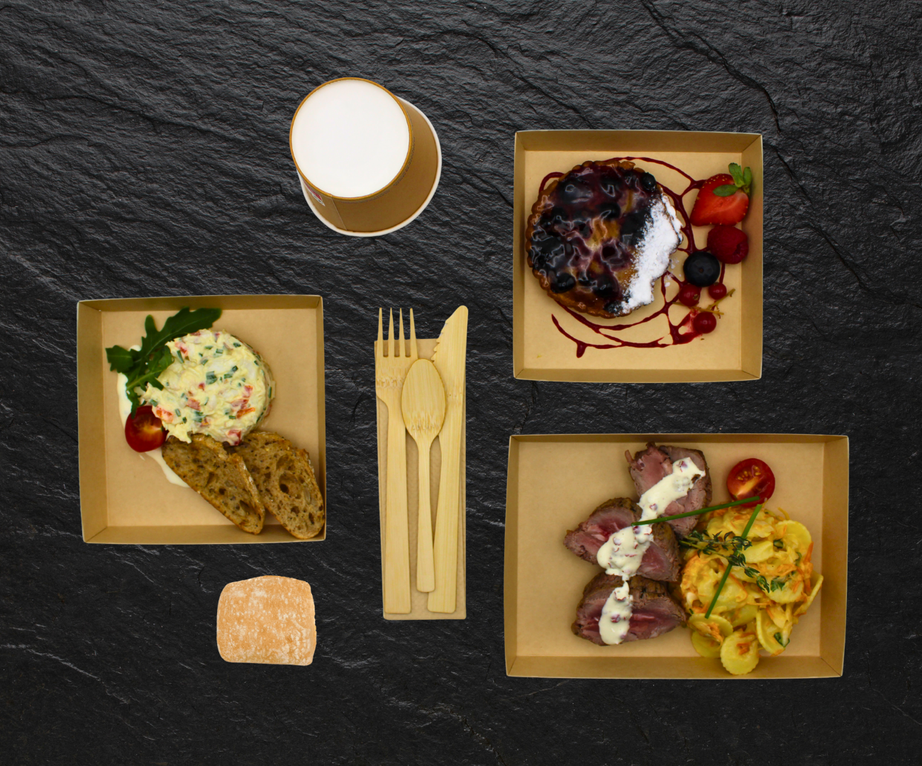 Plateau repas entièrement RECYCLABLE, kit couverts bambou et verre kraft