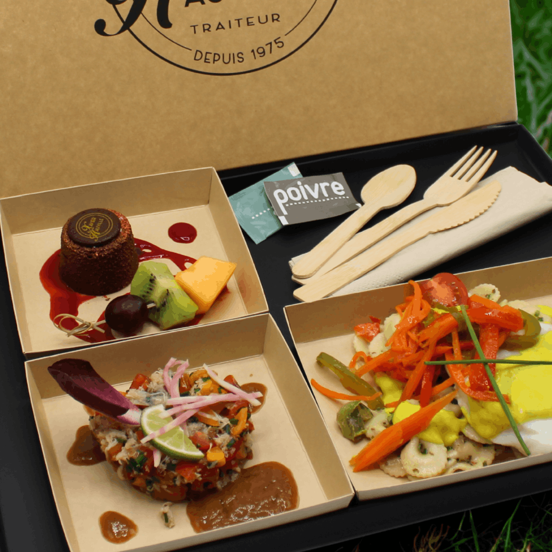 Plateau repas entièrement RECYCLABLE, kit couverts bambou et verre kraft