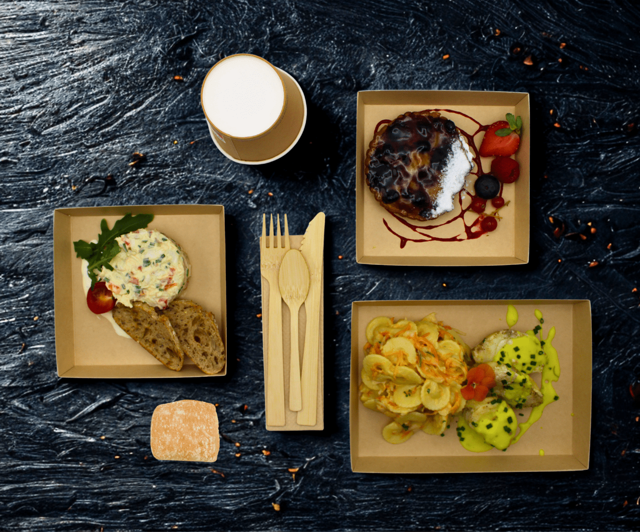 Plateau repas entièrement RECYCLABLE, kit couverts bambou et verre kraft