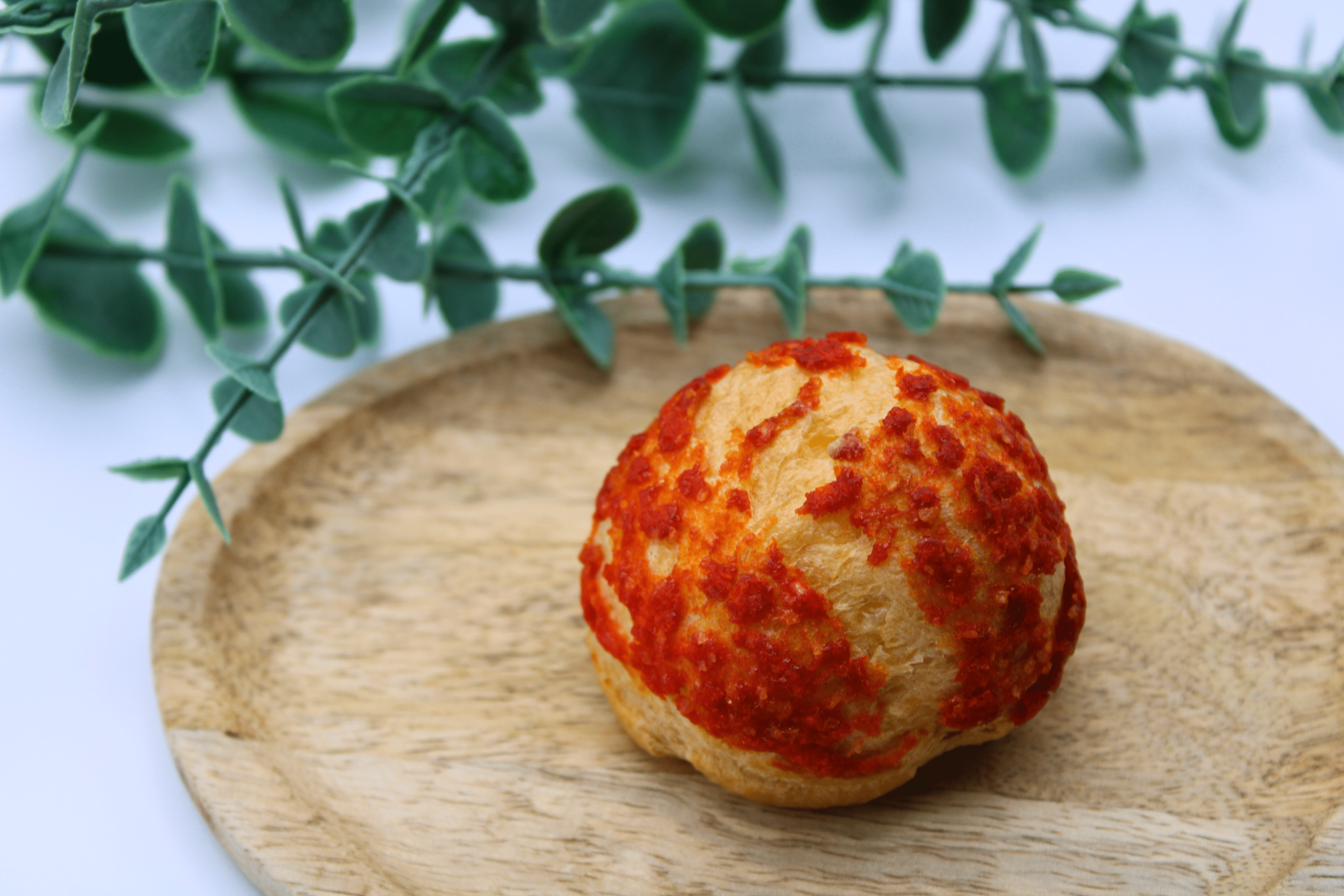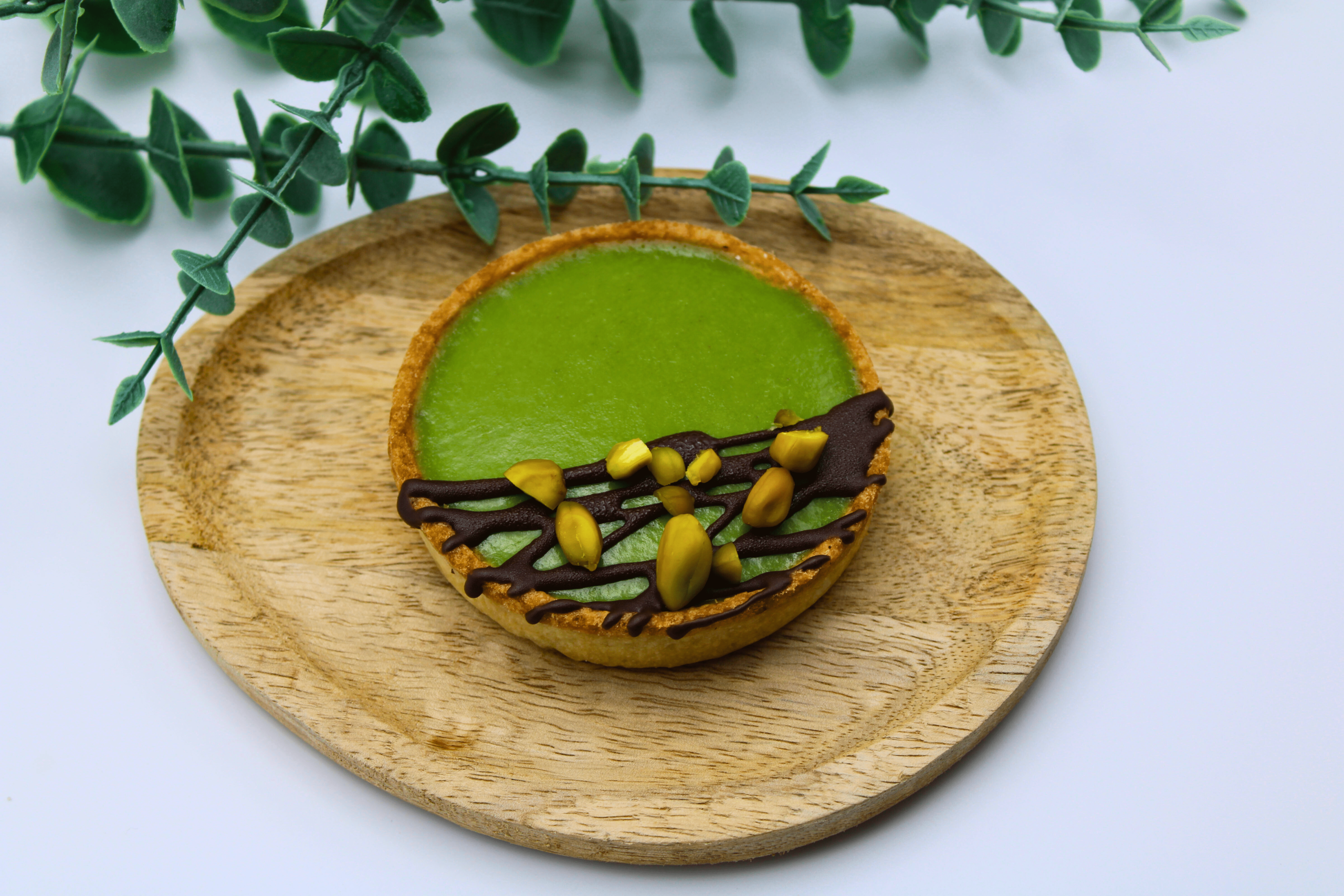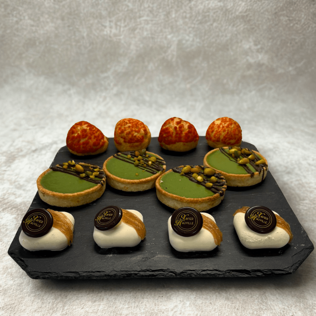 Chou craquelin mandarine, tartelette façon Dubaï (chocolat pistache) et tartelette façon Mont-Blanc (myrtille et crème de marron)